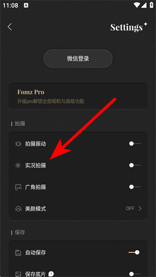 2、在設(shè)置界面,找到實況拍攝選項并將其開啟。