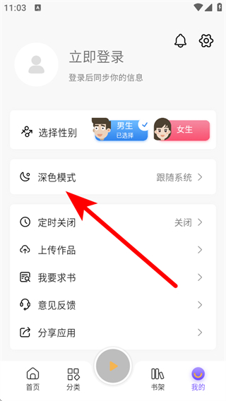 2、在個人界面,點擊深色模式選項,進入深色模式設(shè)置頁面。