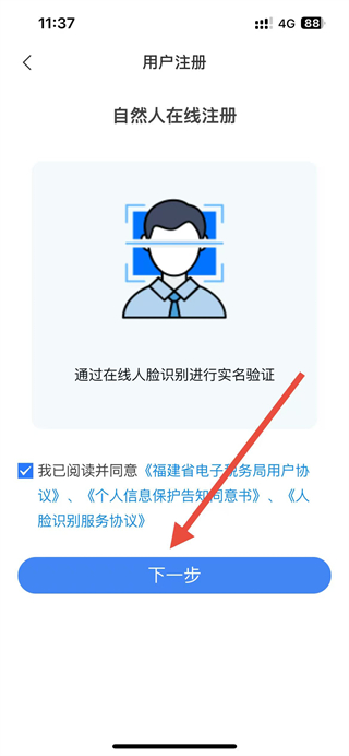 3、在用戶注冊(cè)頁(yè)面勾選已閱讀并同意相關(guān)協(xié)議,點(diǎn)擊下一步。