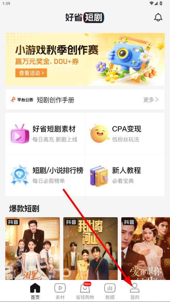 1、打開好省短劇APP,點(diǎn)擊底部導(dǎo)航欄最右側(cè)我的選項(xiàng),進(jìn)入個(gè)人頁(yè)面。