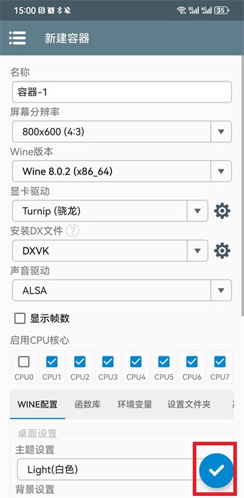 2、緊接著在彈出的新建容器界面,直接點擊右下角的【對號】完成容器的創(chuàng)建;