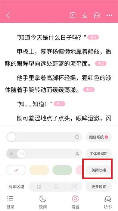 4、在設(shè)置界面中就可以看到【關(guān)閉吐槽】按鈕,點(diǎn)擊按鈕就可以關(guān)閉吐槽功能。