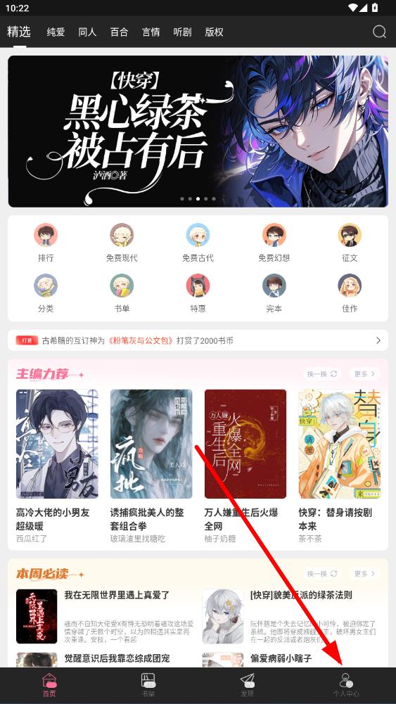 1、打開書耽app,進(jìn)入首頁(yè)后點(diǎn)擊底部導(dǎo)航欄最右側(cè)個(gè)人中心。