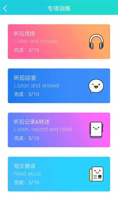 這是一款為學(xué)生打造的學(xué)習(xí)英語聽力、口語的一款app,用戶可以根據(jù)練習(xí)選擇自己需要學(xué)習(xí)的英語知識,用戶可以選擇練習(xí)朗讀英語短文,練習(xí)后app會根據(jù)練習(xí)的內(nèi)容打分,學(xué)生可以在這里學(xué)習(xí)專業(yè)的英語知識,提高自己的英語口語。