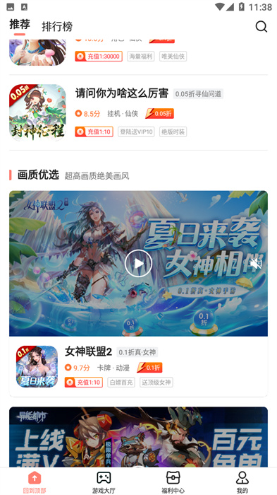 1、在主頁中每周會為用戶推薦游戲和精品游戲推薦、人氣飆升,查看各種優(yōu)質(zhì)畫面的游戲推薦;