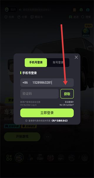 3、在手機號登錄界面輸入手機號碼,點擊“獲取”驗證碼。