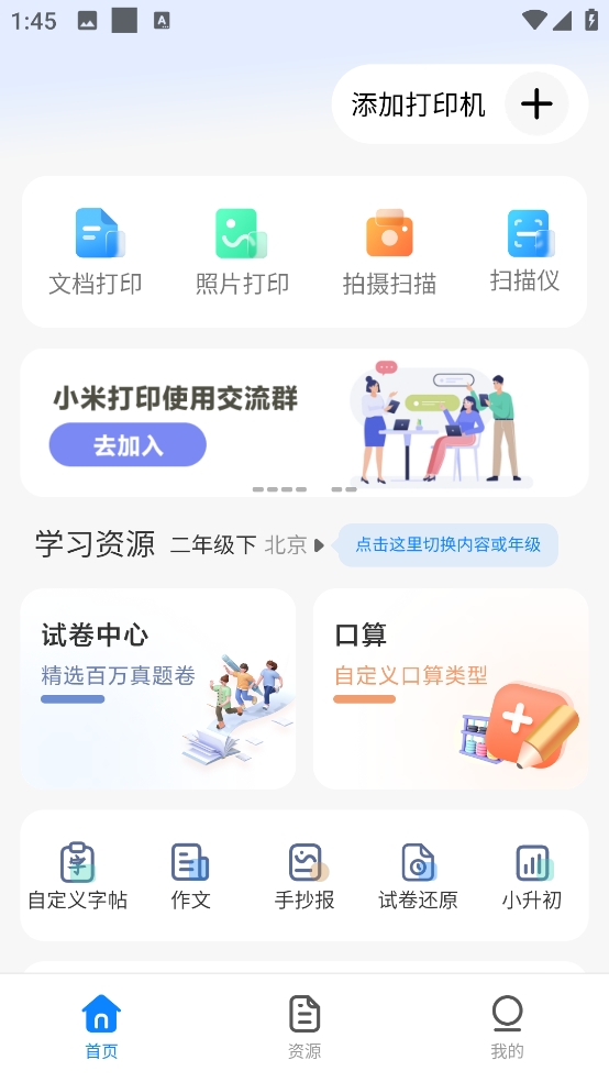 1、下載安裝成功后,找到小米口袋打印機(jī)可以看到自定義字帖、作文、手抄報(bào)、試卷還原等功能;