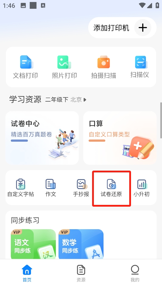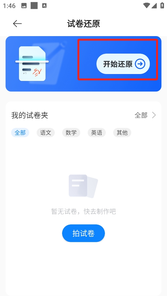 2、在首頁(yè)的頁(yè)面中找到試卷還原功能,對(duì)于已經(jīng)擁有字跡的試卷進(jìn)行還原;