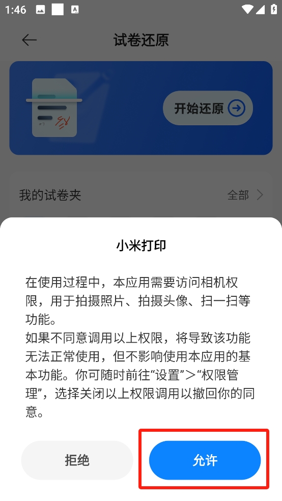 4、彈出提醒頁(yè)面新手第一次使用可以仔細(xì)閱讀,點(diǎn)擊允許后將自動(dòng)開(kāi)啟拍照模式進(jìn)行試卷還原。
