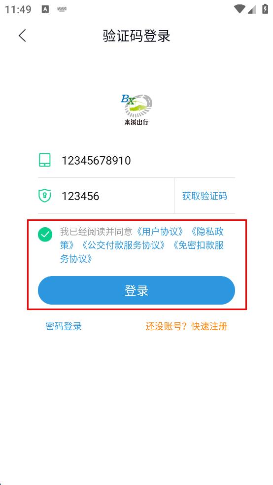 4、勾選“我已經(jīng)閱讀并同意用戶協(xié)議,隱私政策,公交付款服務(wù)協(xié)議,免密扣款服務(wù)協(xié)議,然后點(diǎn)擊“登錄”按鈕,完成登錄操作。