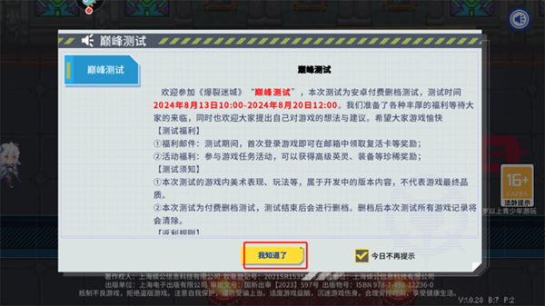 1、進入到游戲內(nèi)之后,將會有著一個測試信息界面,玩家看完后點擊【我知道了】按鈕即可;