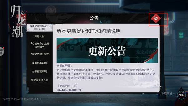 1、進(jìn)入到游戲的場景內(nèi)之后,將會(huì)出現(xiàn)一個(gè)游戲公告頁面,這個(gè)頁面內(nèi)有著多種不同的活動(dòng)信息,點(diǎn)擊屏幕右上方的紅色按鈕可以進(jìn)行關(guān)閉;