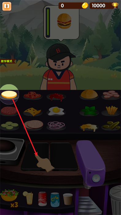2、進入到教學模式之中后,玩家可以按照顧客的需求來進行漢堡的制作,首先需要拖動漢堡胚到盤子上;