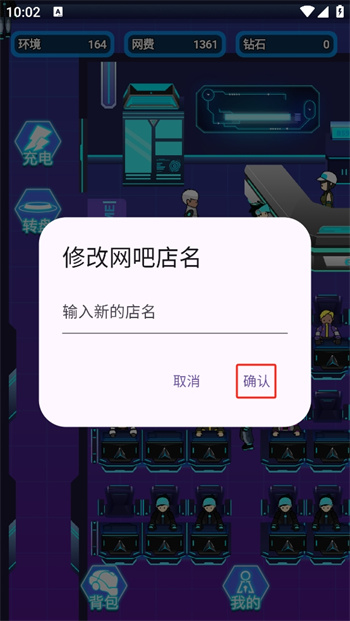 4、可以為自己網(wǎng)吧起一個獨特的店鋪名字,在橫線上方輸入自己的新店面,然后點擊下角的確認就可以為自己店鋪起一個獨有的名字了,展開全新的游戲模擬經營過程;