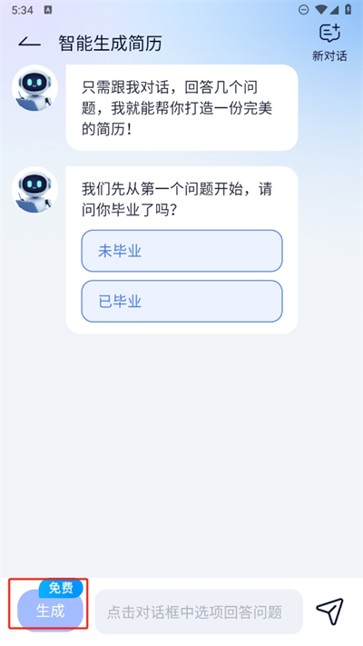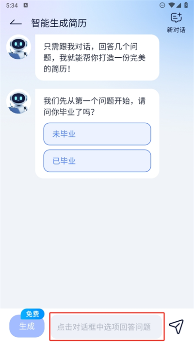 3、進(jìn)入后可以看到有智能對(duì)話助手的出現(xiàn),將會(huì)通過(guò)回答幾個(gè)問(wèn)題打造一個(gè)完美簡(jiǎn)歷;