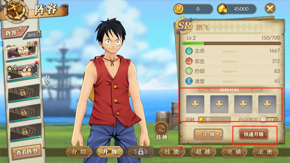 3、接著再升級(jí)這里就可以看到需要消耗升級(jí)的材料填充,然后點(diǎn)擊升級(jí)或者快速升級(jí)即可直接升級(jí)角色等級(jí);
