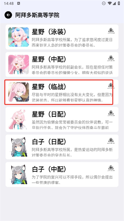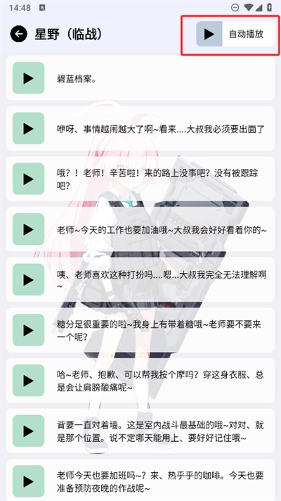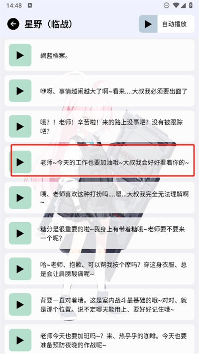 3、緊接著我們就能看到有超多關(guān)于星野臨戰(zhàn)時的語音包,點擊這個文字就能直接播放語音;