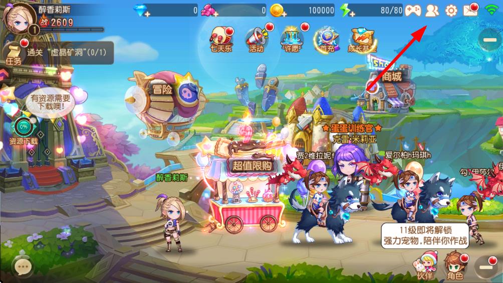 1、打開彈彈島游戲,進入主界面后點擊界面右上角好友的圖標進入社交相關(guān)頁面。