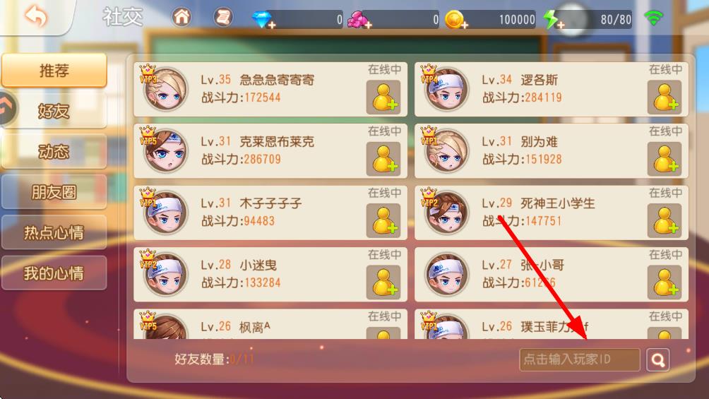 2、在社交頁面中找到并點擊下方點擊輸入玩家ID的輸入框,輸入你想要添加好友的玩家ID再點擊旁邊的搜索按鈕。