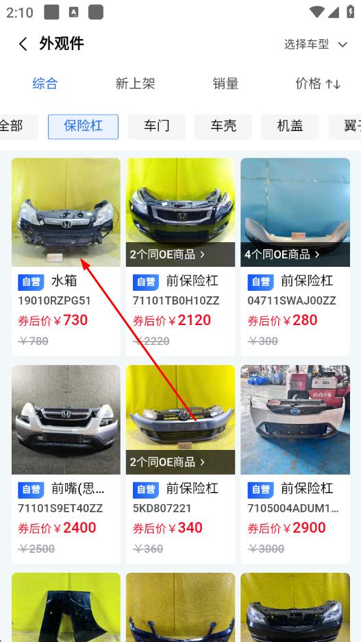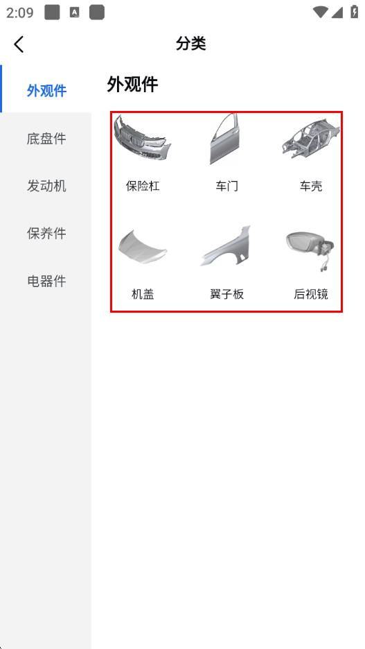 3、以點(diǎn)擊“外觀件”為例,進(jìn)入分類頁(yè)面后,選擇保險(xiǎn)杠、車門等具體配件類別。