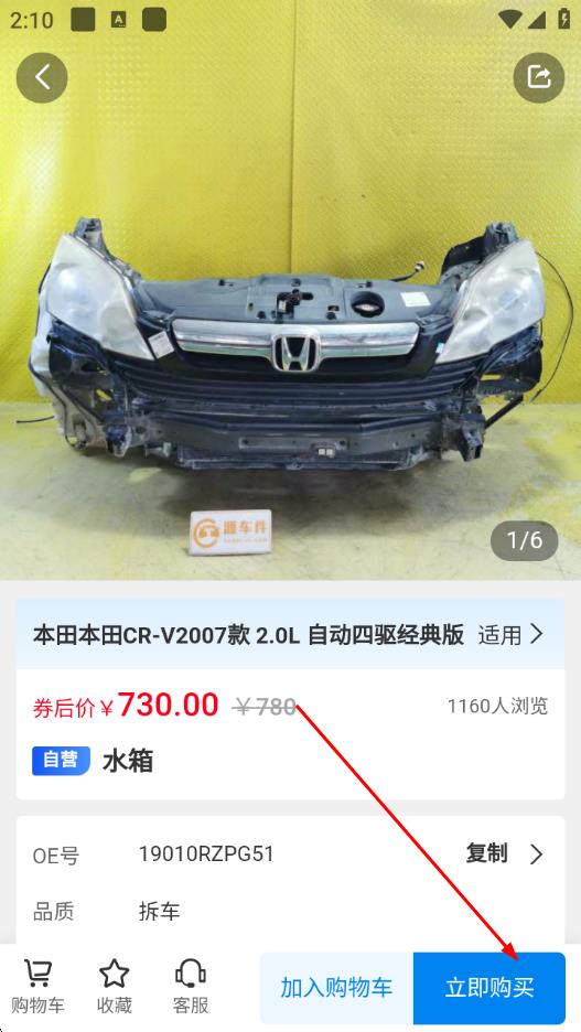 5、在商品詳情頁(yè),確認(rèn)配件適用車型、價(jià)格等信息無(wú)誤后,點(diǎn)擊立即購(gòu)買按鈕,按后續(xù)提示完成支付等購(gòu)買流程。