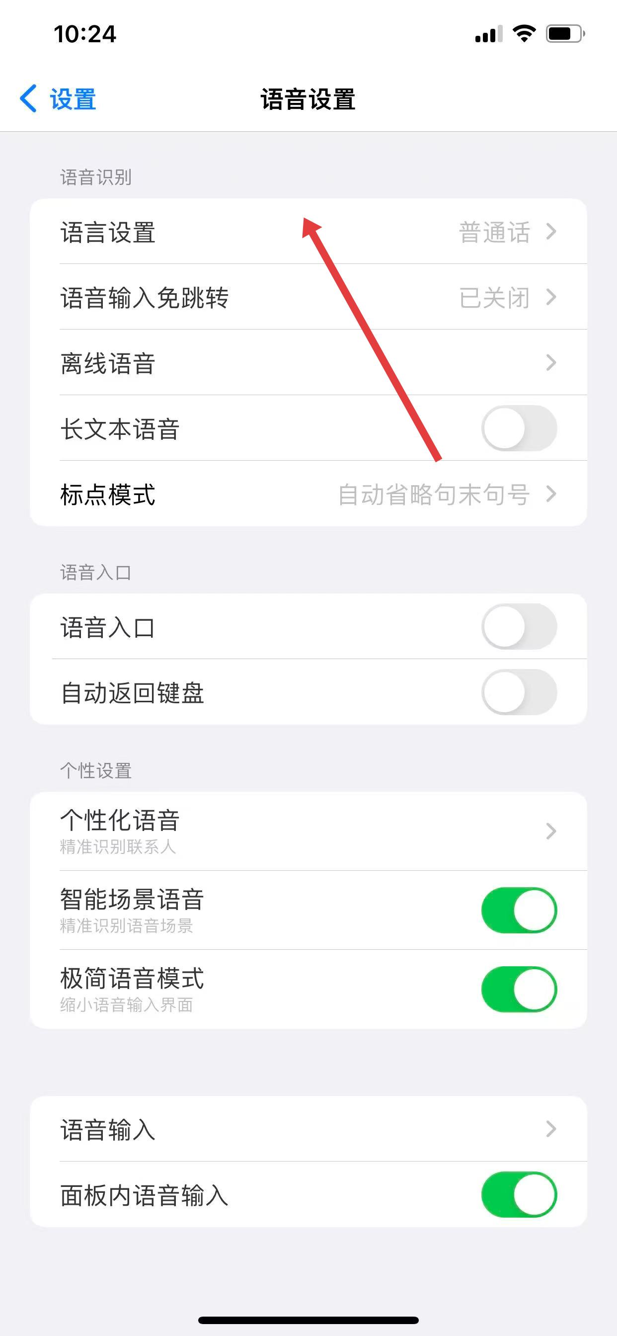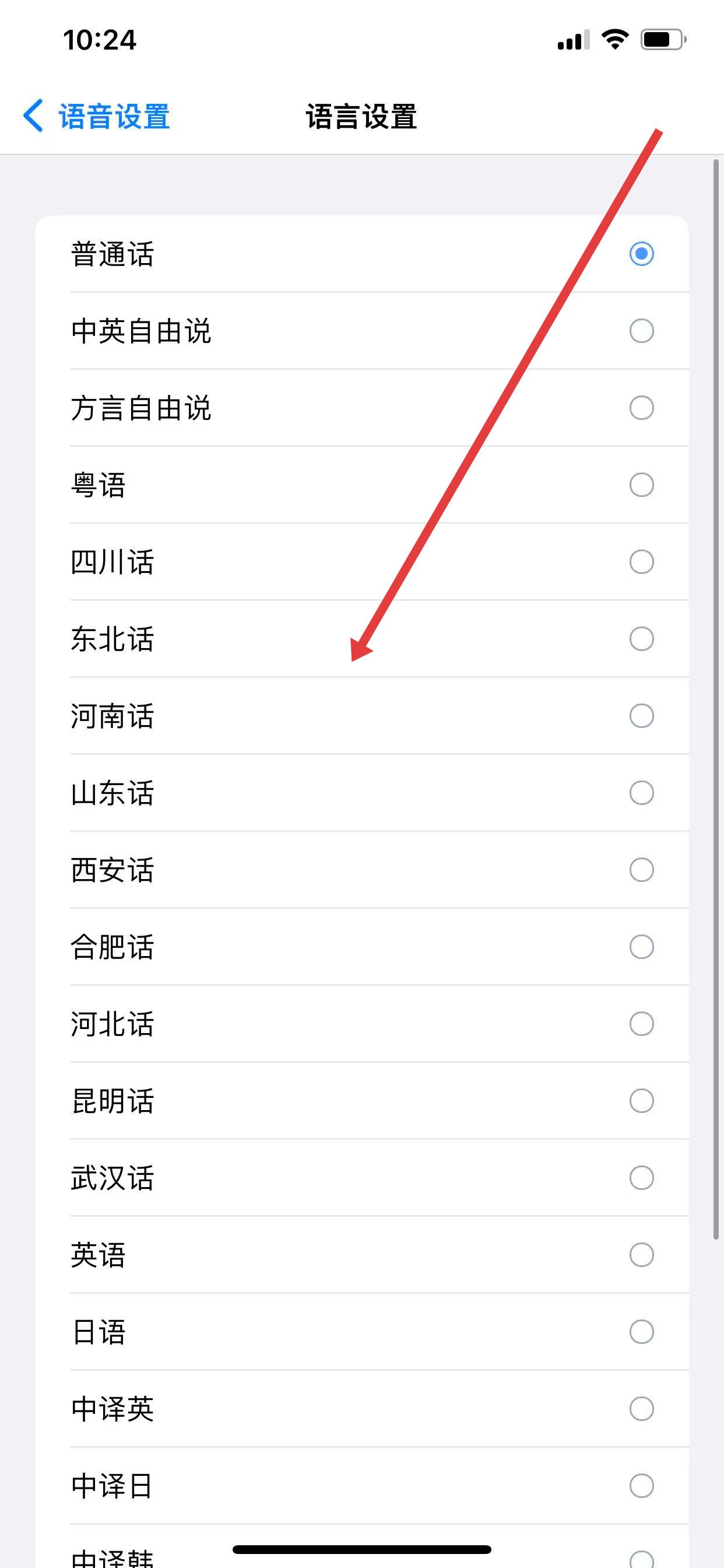 2、在語音設(shè)置頁面,點(diǎn)擊語言設(shè)置選項(xiàng)。