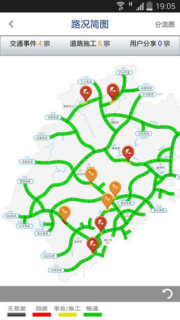 “路況簡圖”版塊:以全省高速路網(wǎng)簡圖為基礎(chǔ),以顏色表示擁堵情況,直觀地展示全省高速路網(wǎng)的通堵狀態(tài)。
