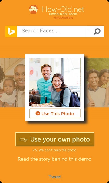 一、點(diǎn)擊【 Usw This photo 】按鈕點(diǎn)擊【 Usw This photo 】之后,稍等一會(huì)、系統(tǒng)就會(huì)自動(dòng)顯示,并且能判斷出這一張照片中的人的年齡。測(cè)試了幾次不同的照片,發(fā)現(xiàn)還是蠻準(zhǔn)的。