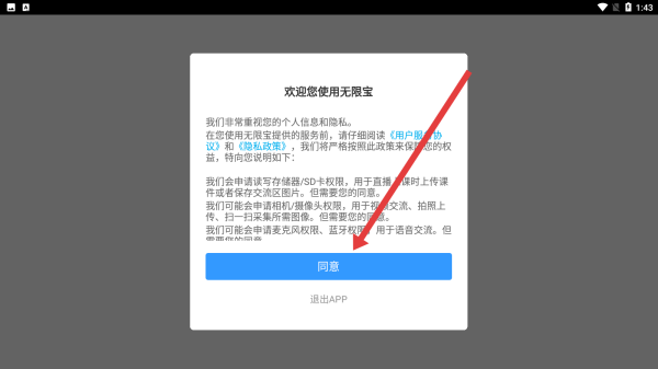 1、在無限寶用戶協(xié)議彈窗點擊同意,進入登錄界面,開啟賬號登錄流程。