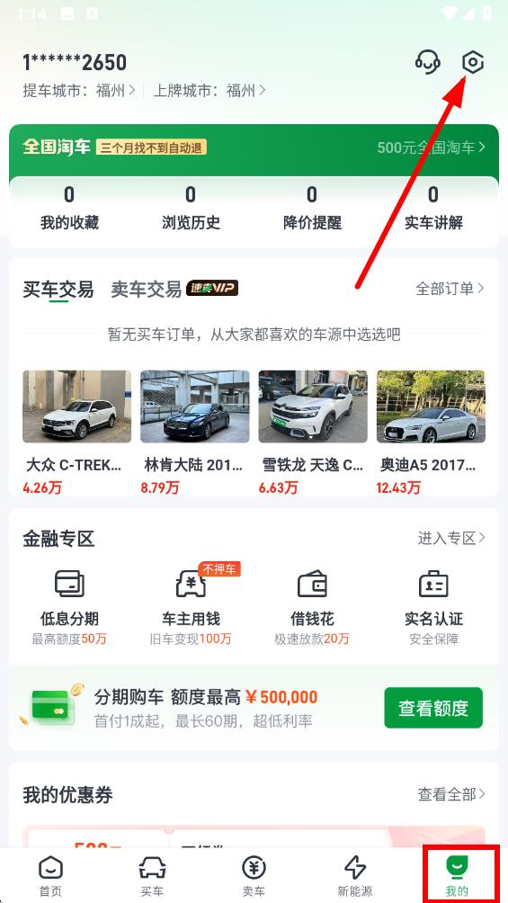 1、打開瓜子二手車app,點(diǎn)擊底部導(dǎo)航欄中的我的選項(xiàng),進(jìn)入個(gè)人頁面后點(diǎn)擊頁面右上角的設(shè)置圖標(biāo)。