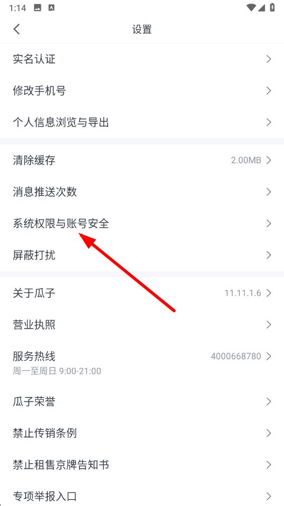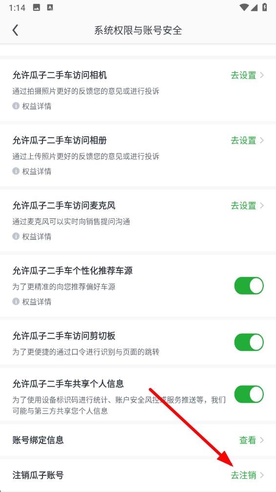 3、在系統(tǒng)權(quán)限與賬號(hào)安全界面里,下滑找到注銷瓜子賬號(hào)選項(xiàng),點(diǎn)擊去注銷,按照頁面提示完成身份驗(yàn)證等流程,確認(rèn)注銷賬號(hào)即可。