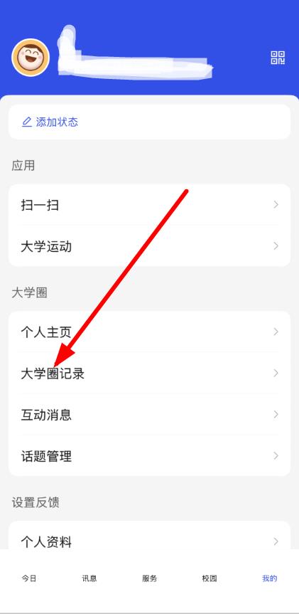 2、在個人界面,找到并點擊大學(xué)圈記錄選項,進入記錄頁面。