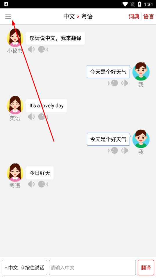 1、打開(kāi)同聲翻譯超級(jí)版App,點(diǎn)擊界面左上角的三條橫線圖標(biāo),打開(kāi)側(cè)邊欄菜單。