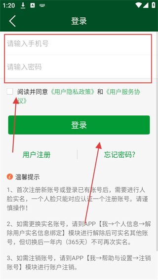 3、在登錄頁面,輸入手機號和密碼,勾選閱用戶隱私政策和服務(wù)協(xié)議,點擊登錄。