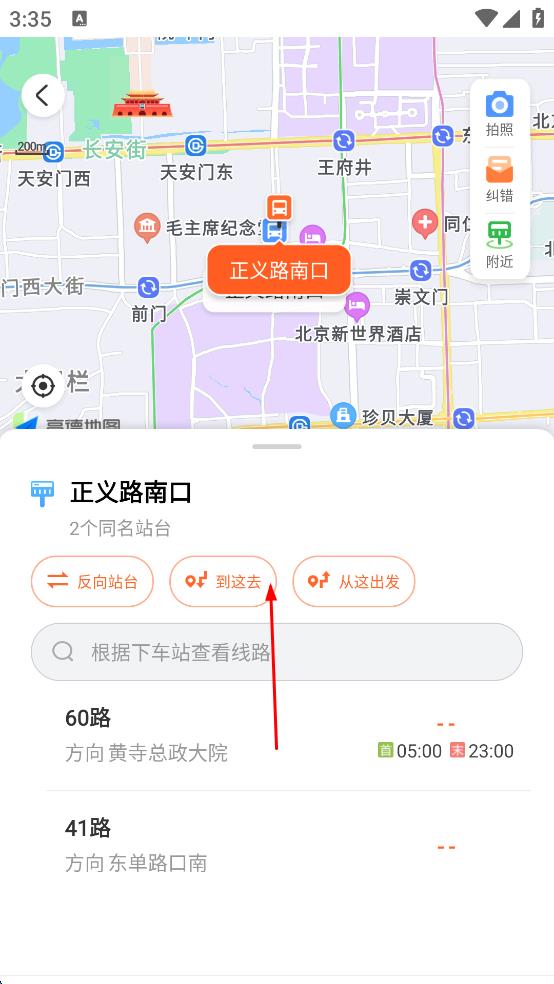 3、進入站點詳情地圖頁,能看到站點位置及途經(jīng)公交,根據(jù)需求點擊“到這去”“從這出發(fā)”等按鈕,規(guī)劃前往或離開該站點的出行路線。