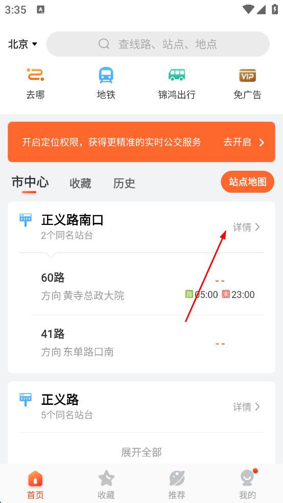 2、選定城市后進入主界面,在“市中心”等分類下找到目標站點如“正義路南口”,點擊站點右側“詳情”,查看站點更詳細信息及途經(jīng)公交線路。