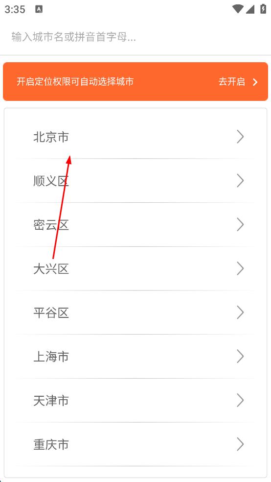 1、進入城市選擇頁面,可在搜索欄輸入城市名或拼音首字母,也可直接點擊列表中目標城市如“北京市”,開啟定位權限能自動選城市,按需操作選定城市。