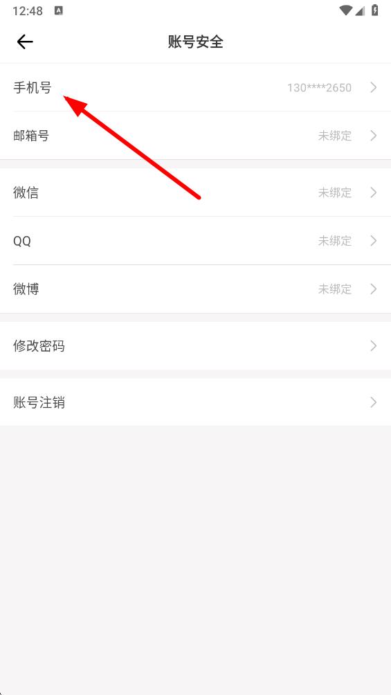 4、在賬戶安全界面中,點(diǎn)擊手機(jī)號(hào)選項(xiàng),進(jìn)入手機(jī)綁定頁面。