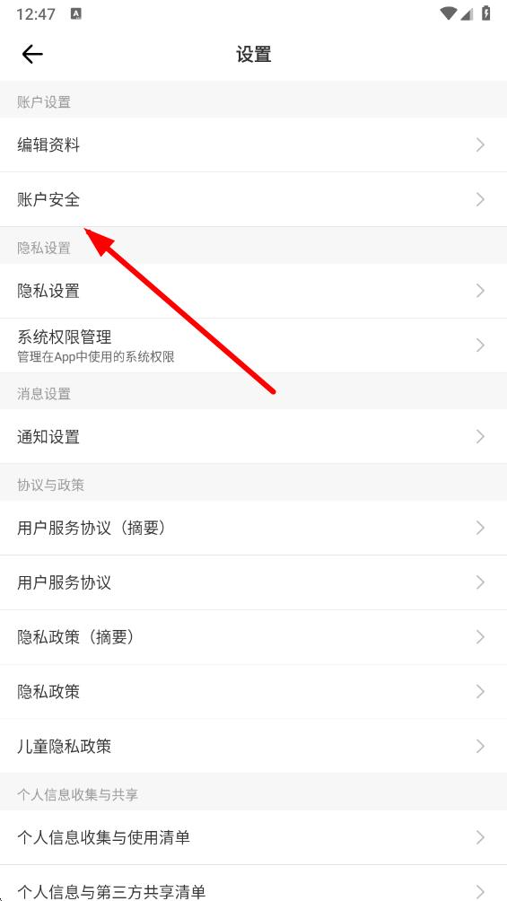 3、在設(shè)置頁面里,找到并點(diǎn)擊賬戶安全選項(xiàng)。