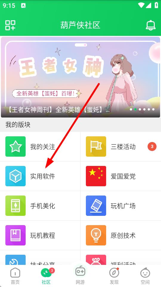 2、在社區(qū)頁(yè)面找到并點(diǎn)擊實(shí)用軟件,等你想發(fā)布帖子的對(duì)應(yīng)板塊進(jìn)入板塊詳情頁(yè)。