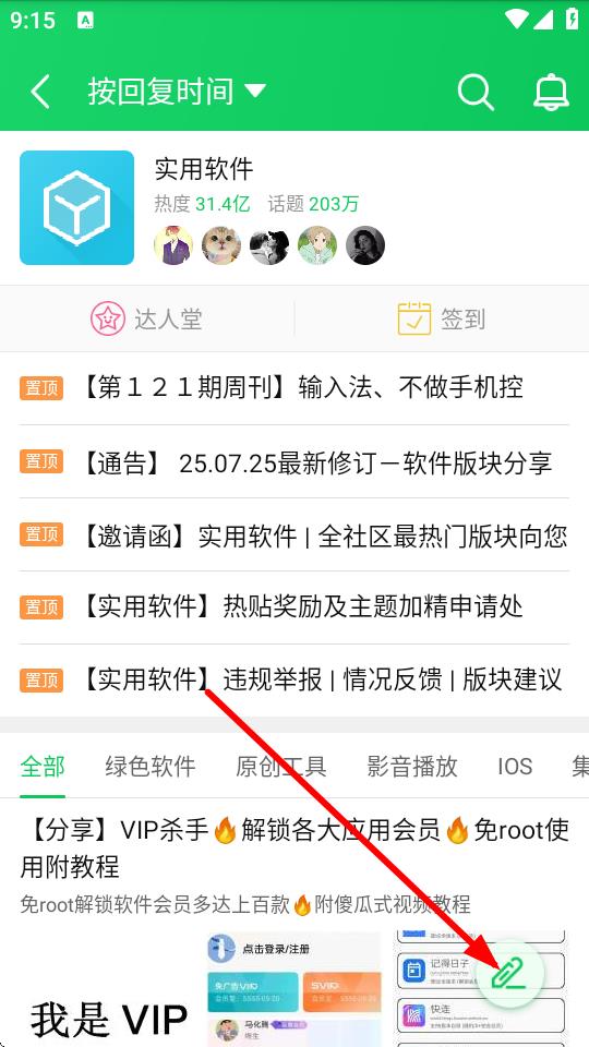 3、在板塊詳情頁(yè)右下角點(diǎn)擊綠色帶筆的圖標(biāo),即可進(jìn)入編輯頁(yè)面,輸入內(nèi)容后點(diǎn)擊發(fā)布,就能成功發(fā)出帖子。