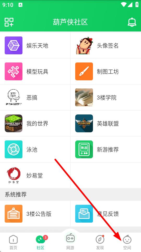 1、打開葫蘆俠App,點擊底部導(dǎo)航欄中的空間選項進(jìn)入個人空間頁面。