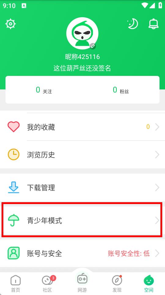 2、在個人空間頁面中,找到并點擊青少年模式選項。