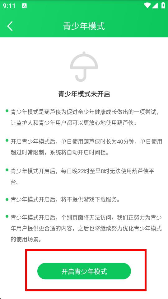 3、進(jìn)入青少年模式頁面后,點擊開啟青少年模式按鈕,按照提示完成操作即可開啟。