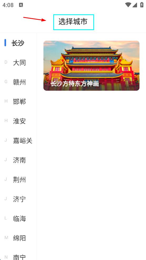 1、打開(kāi)方特旅游軟件,點(diǎn)擊“選擇城市”,在城市列表選長(zhǎng)沙,進(jìn)入長(zhǎng)沙方特東方神畫(huà)專(zhuān)屬頁(yè)面。