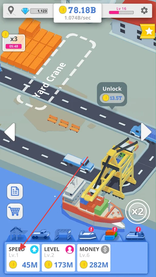 2、留意屏幕下方功能按鈕,花費(fèi)對(duì)應(yīng)金幣升級(jí),提升港口運(yùn)營(yíng)效率,解鎖新功能。