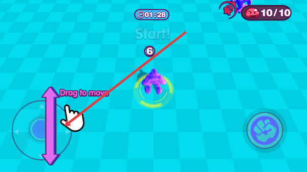2、在游戲場景中(第二張圖),按照左側(cè)提示“Drag to move”,通過拖動左下角的虛擬搖桿。
