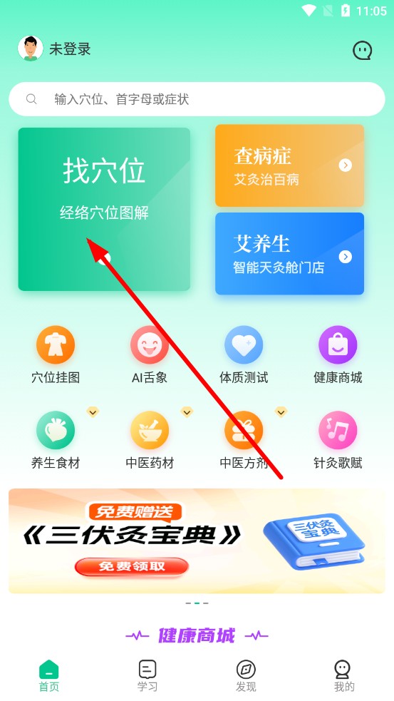 1、打開APP首頁,點「找穴位」,可查身體各部位經(jīng)絡(luò)對應(yīng)穴位,了解艾灸作用。