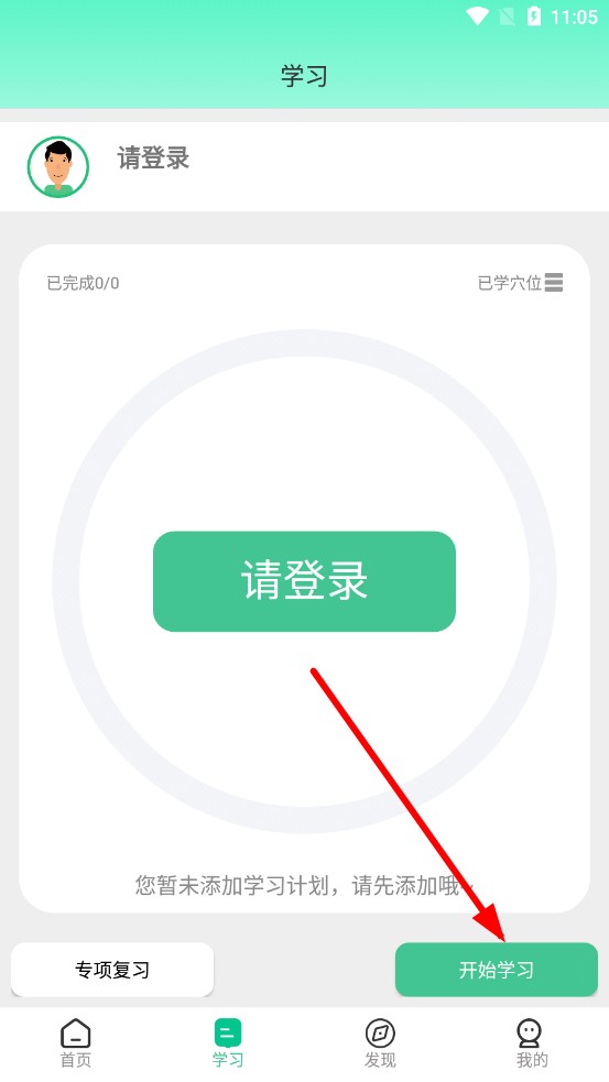 2、點底部「學(xué)習(xí)」,先登錄賬號,再點「開始學(xué)習(xí)」,添加學(xué)習(xí)計劃,系統(tǒng)教艾灸穴位、手法等基礎(chǔ)。