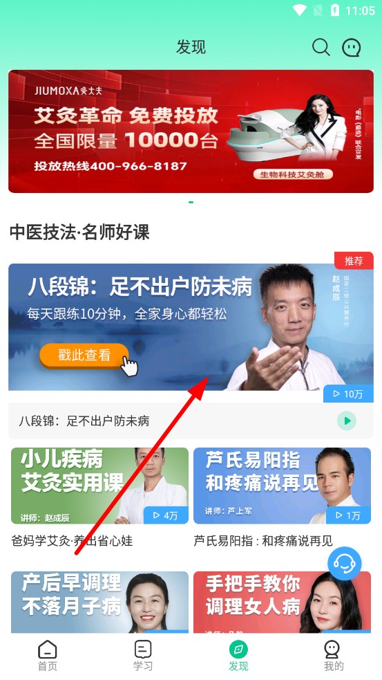 3、切到底部「發(fā)現(xiàn)」,在「中醫(yī)技法·名師好課」選感興趣內(nèi)容,點課程封面的按鈕,就能看專業(yè)老師的艾灸、養(yǎng)生教學(xué)視頻。